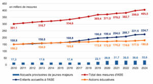 Le rapport met notamment en avant une forte progression du nombre de jeunes pris en charge par l’ASE à la suite de leur majorité. Fin 2024, 32 600 jeunes majeurs bénéficient d’un accueil provisoire jeune majeur (APJM), soit une hausse de 6,5 % par rapport à l’année précédente. Cette augmentation s’explique, entre autres, par le nombre plus élevé de mineurs accueillis les années précédentes (notamment de mineurs non accompagnés) ainsi que par la mise en oeuvre des dispositions de la loi du 7 février 2022.
